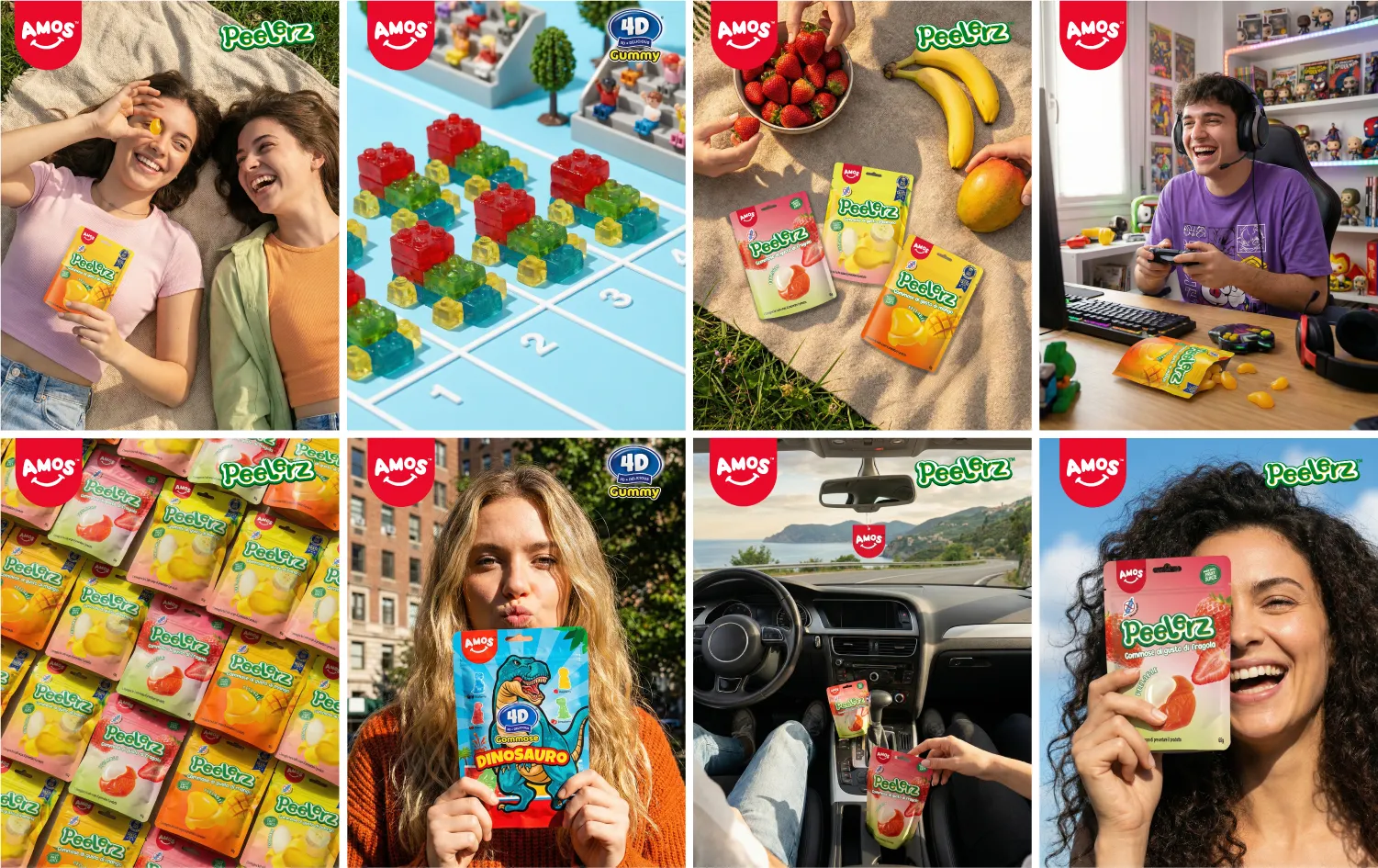 ogni prodotto è protagonista di un racconto dinamico e contemporaneo. Peelerz, Blocks, Dinosauro prendono vita in un mix esplosivo di contenuti tra close-up ipnotici, composizioni grafiche, pack e visual ad alto impatto.
